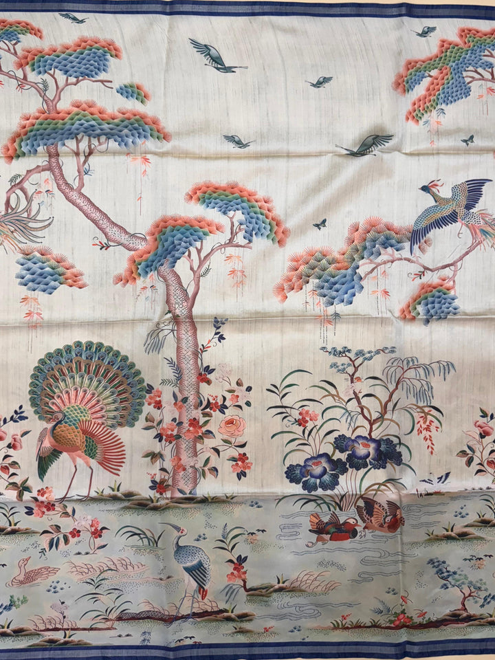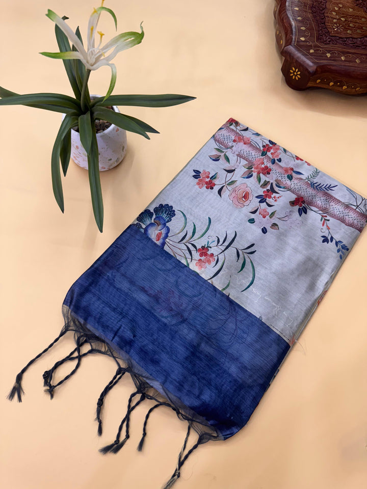 Mallai Silk Peacock Floral Print Saree - BLUE