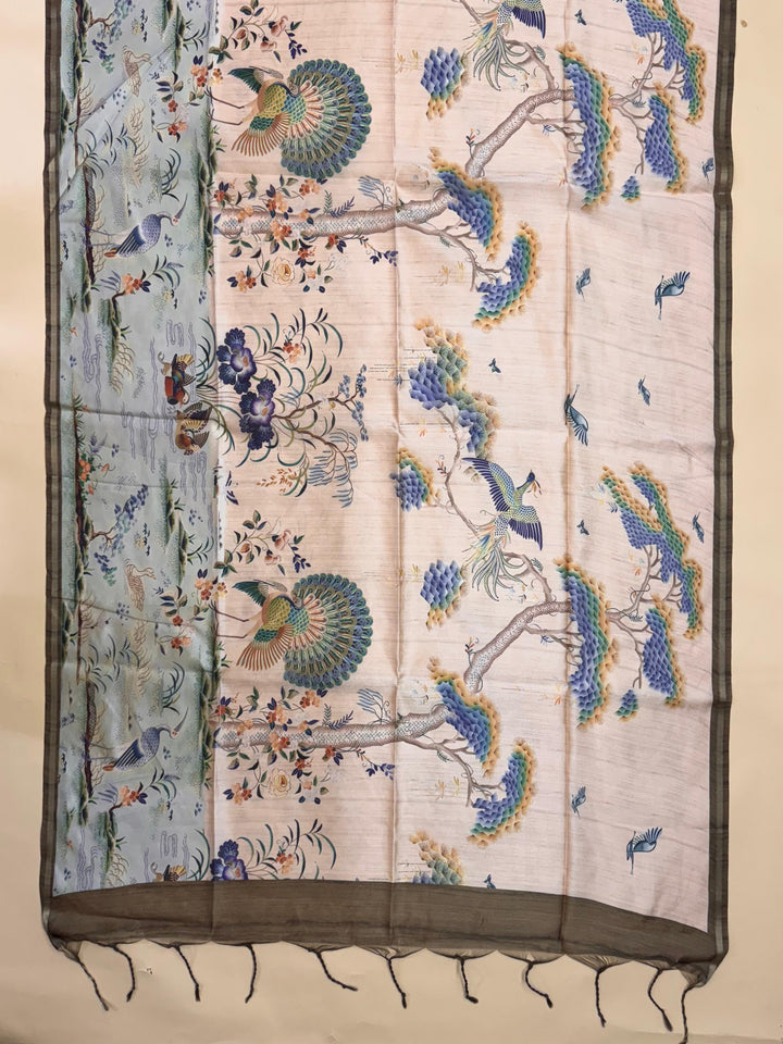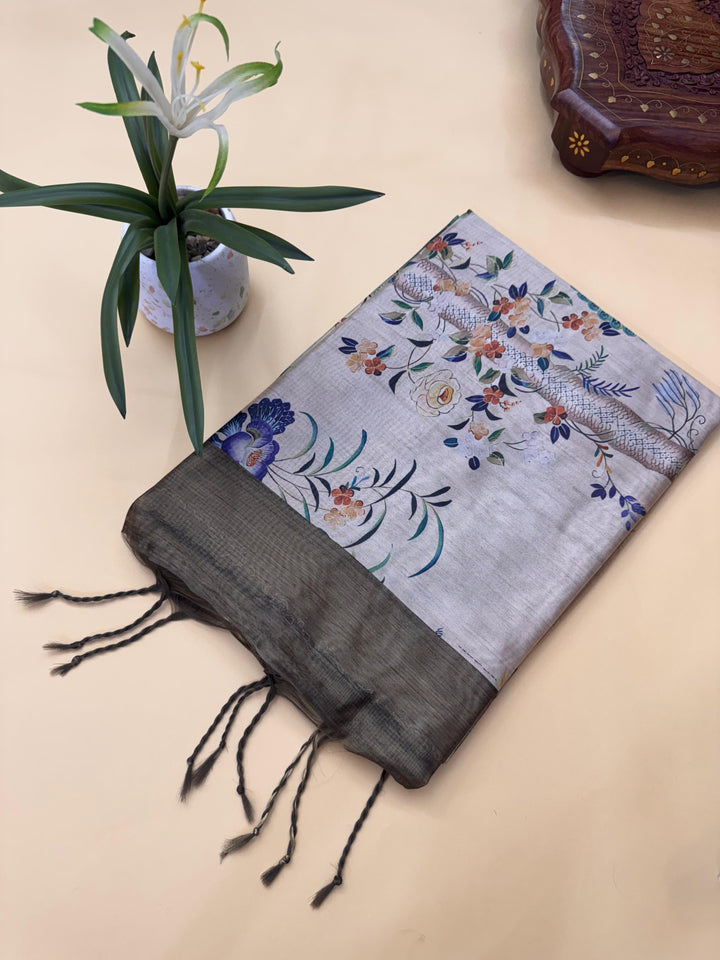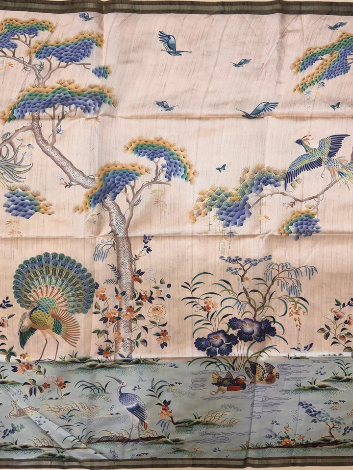 Mallai Silk Peacock Floral Print Saree - MEHNDI