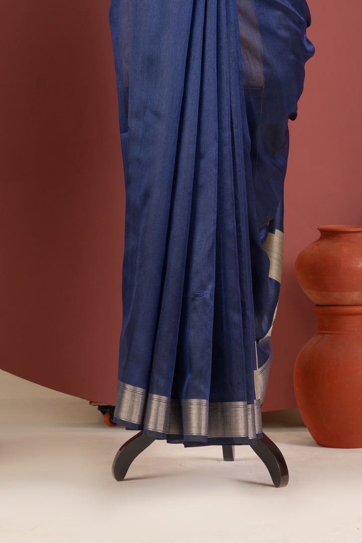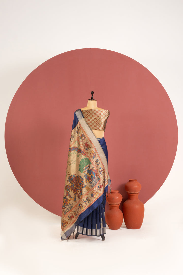 Soft Raw Silk Kalamkari Printed Pallu - BLUE