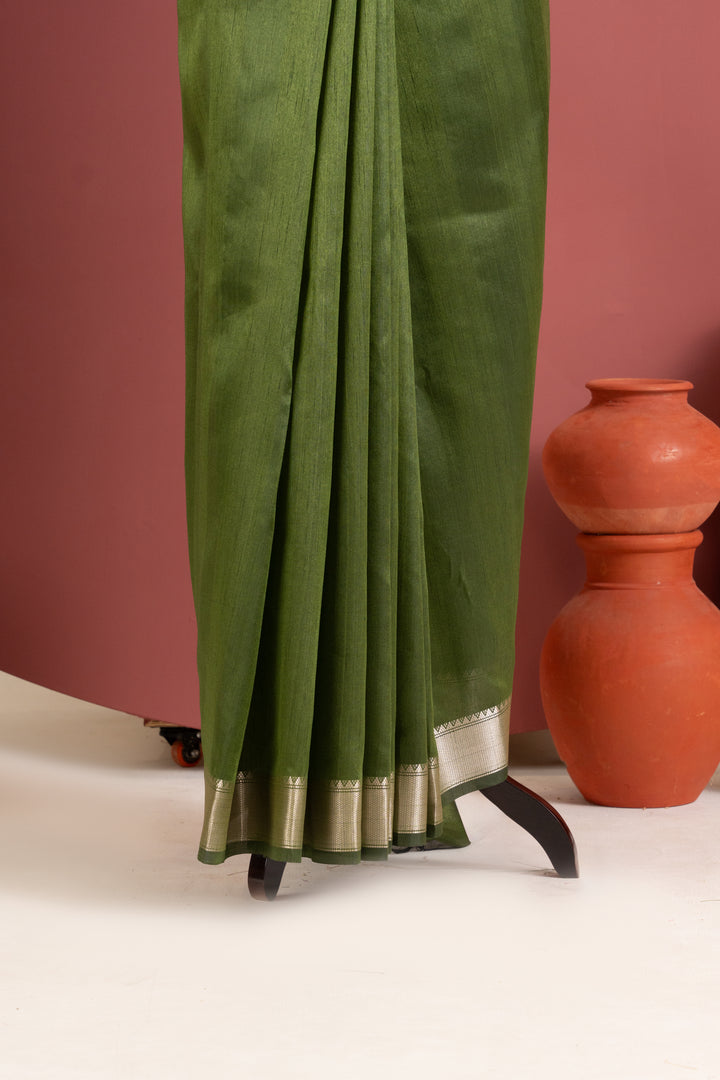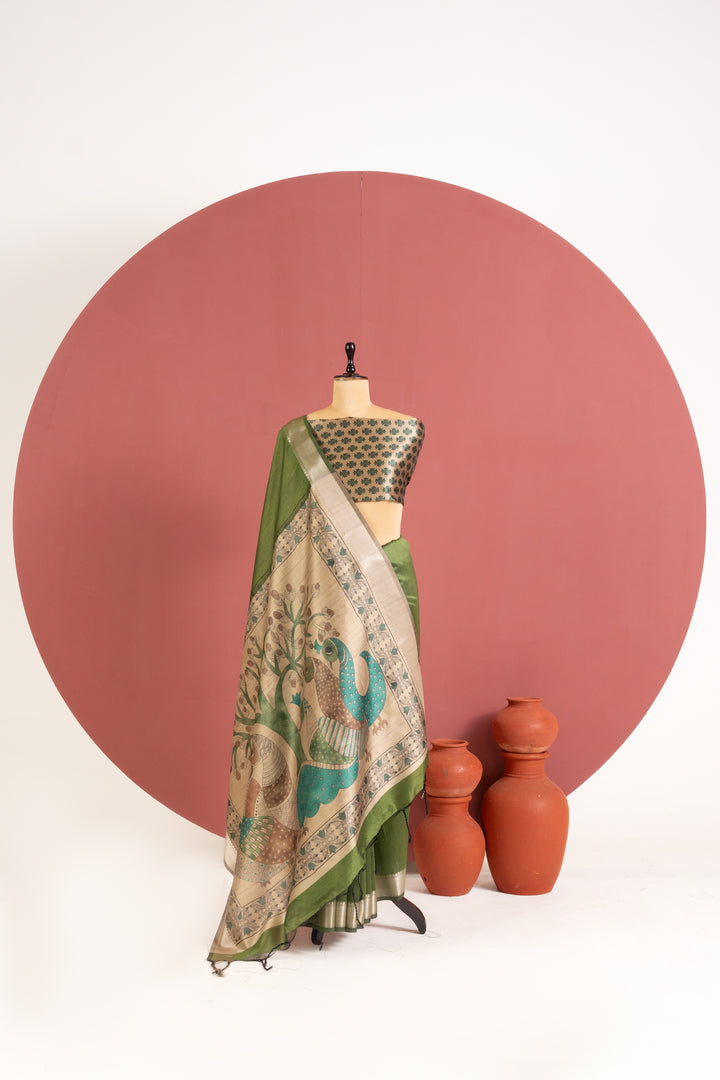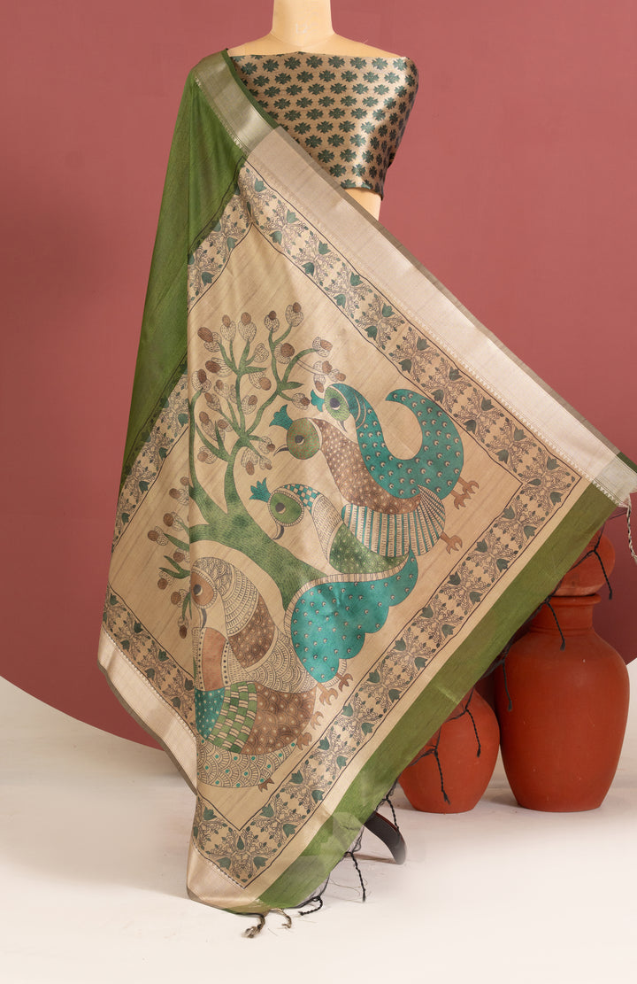 Soft Raw Silk Kalamkari Printed Pallu - MEHNDI GREEN