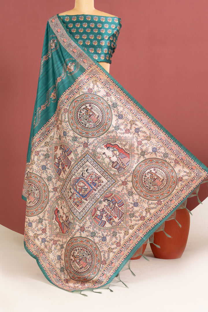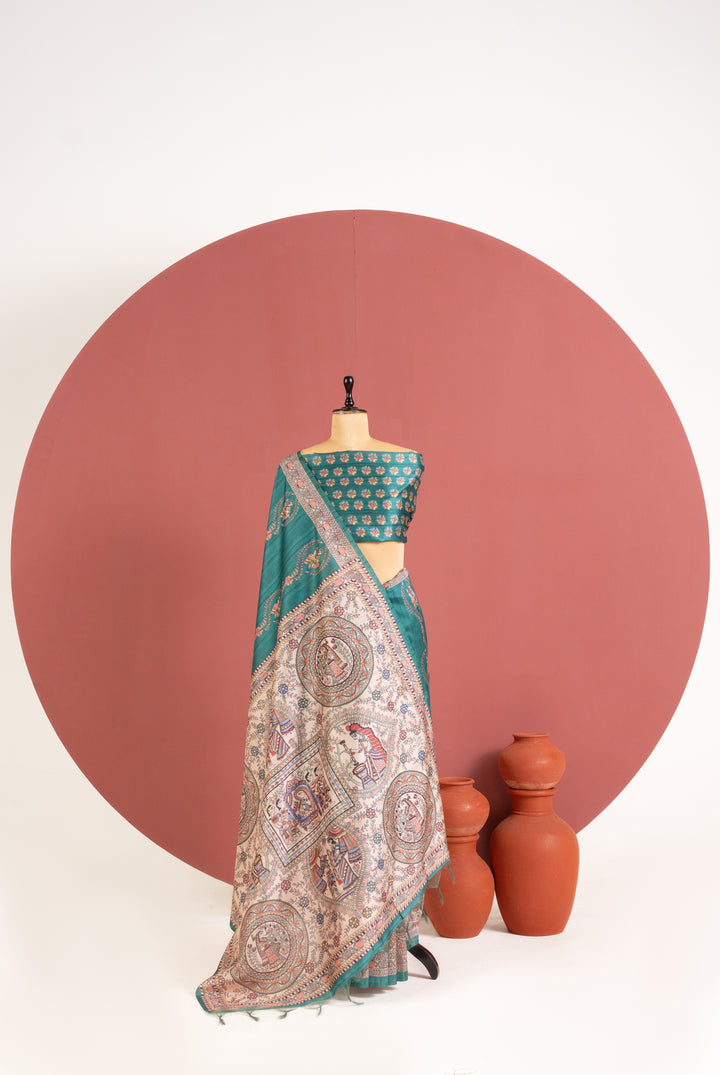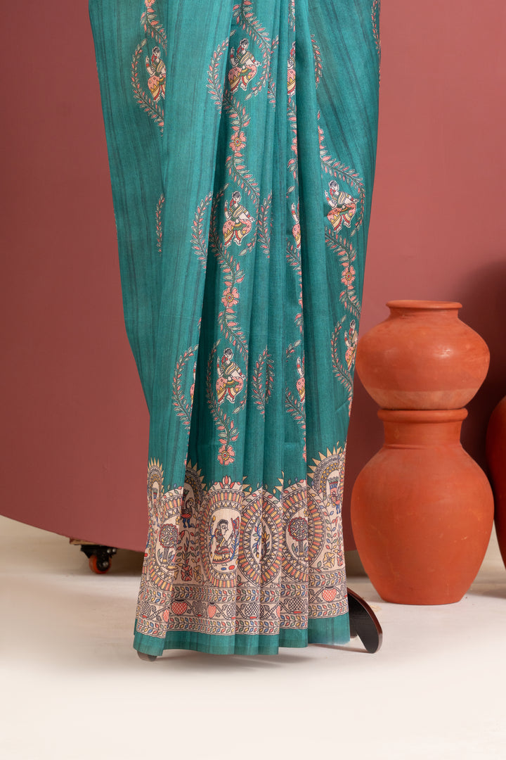 Soft Tussar Silk Madhubani Printed Pallu - Rama