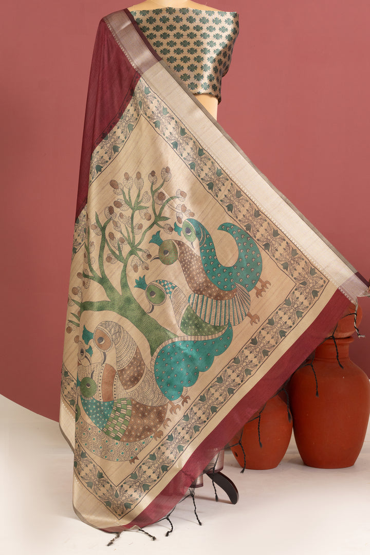 Soft Raw Silk Kalamkari Printed Pallu - RED