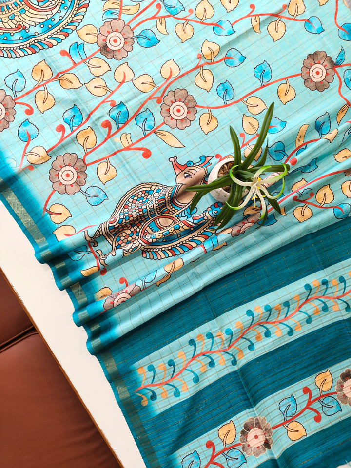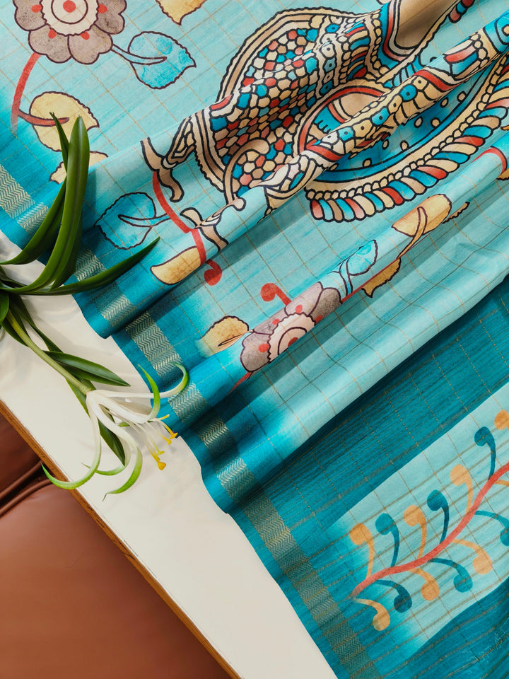 Soft Tussar Checks Kalamkari Silk Saree - BLUE