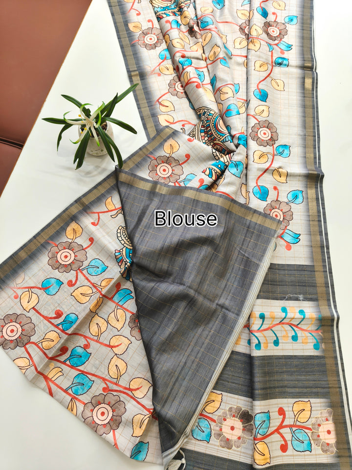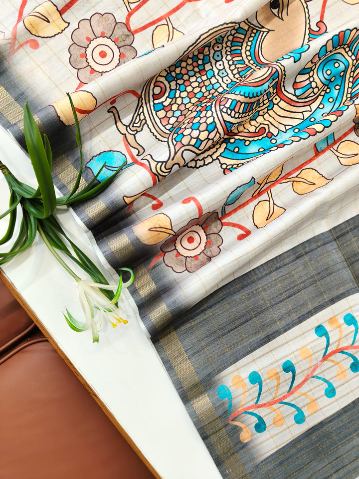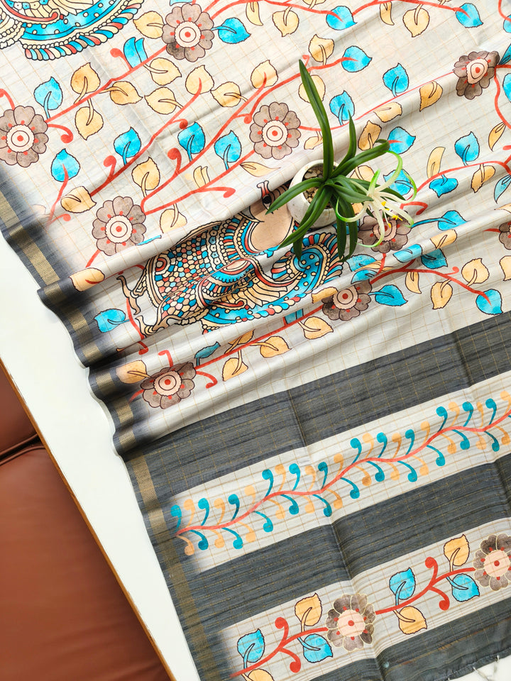 Soft Tussar Checks Kalamkari Silk Saree - GREY