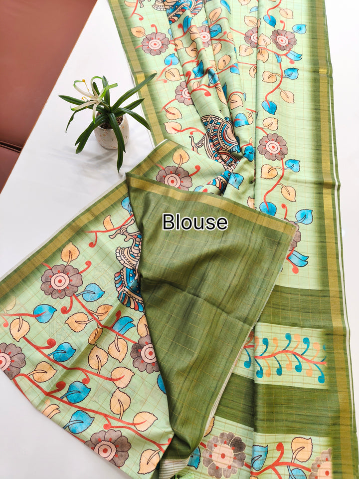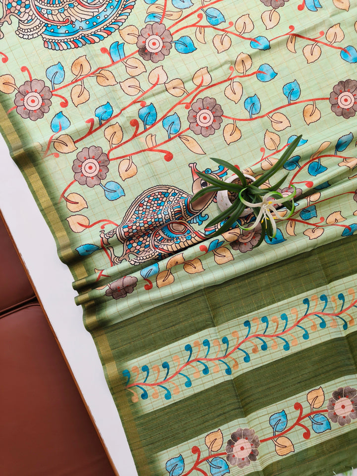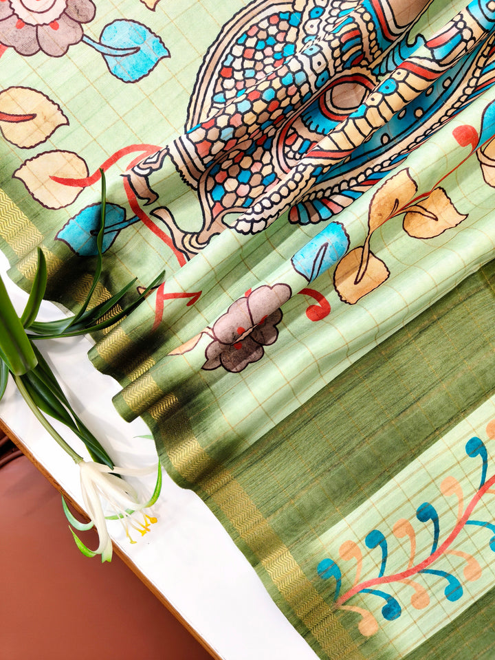 Soft Tussar Checks Kalamkari Silk Saree - MEHNDI