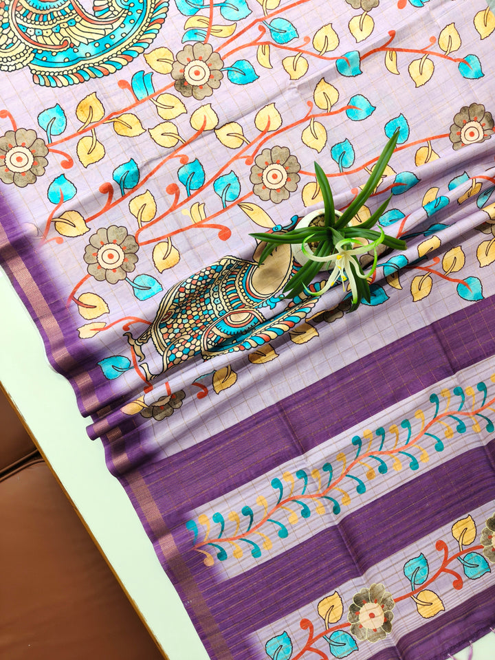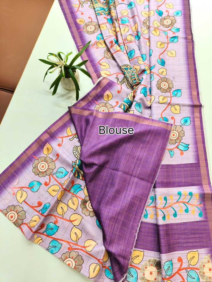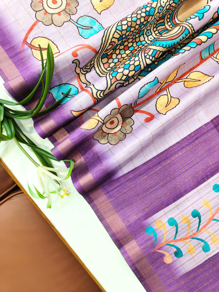 Soft Tussar Checks Kalamkari Silk Saree - PURPLE