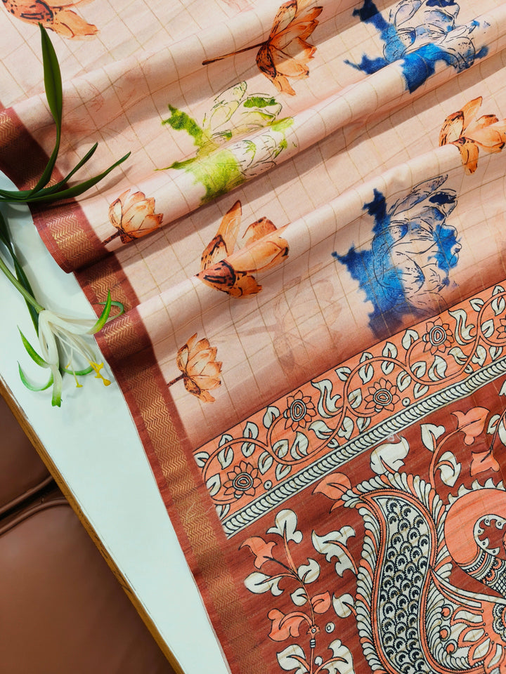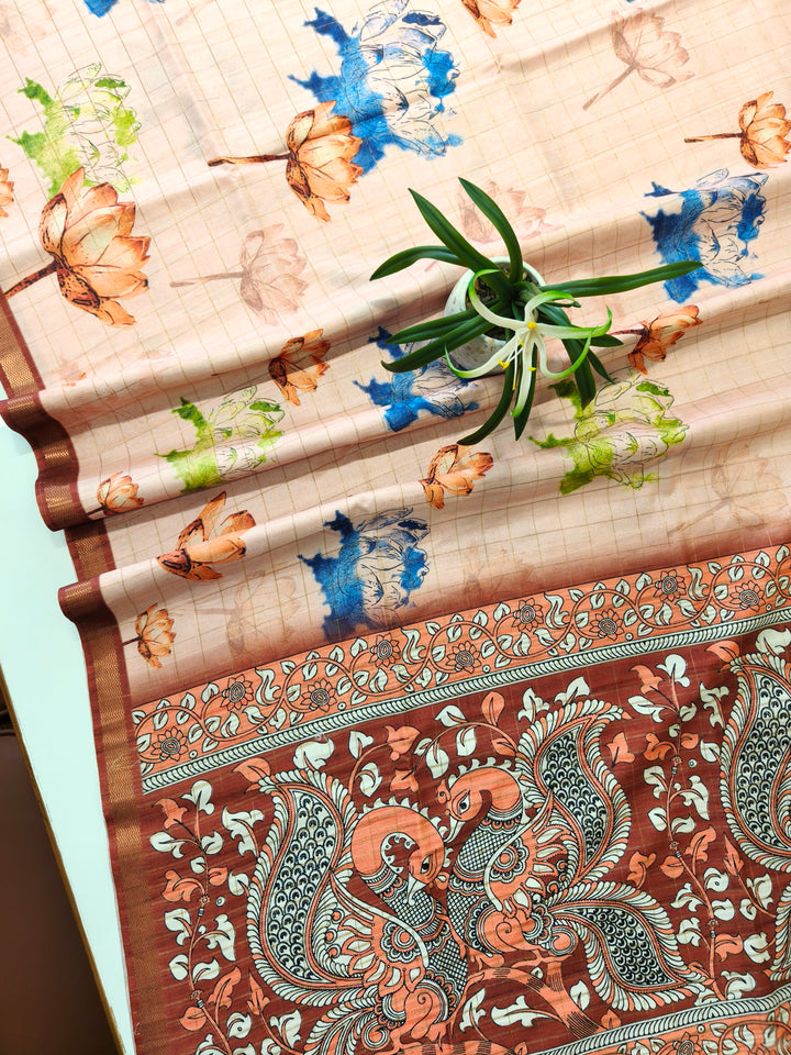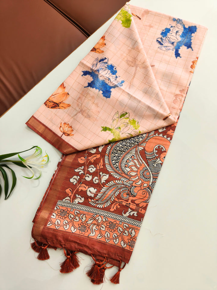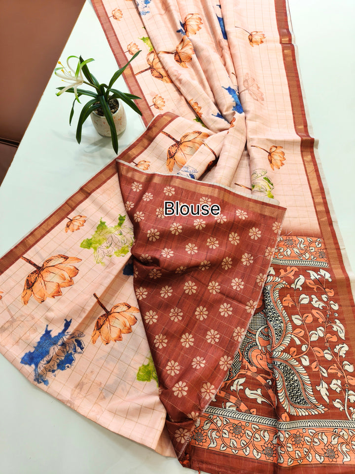 Soft Tussar Checks Saree With Kalamkari Print Saree - BROWN