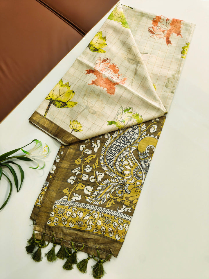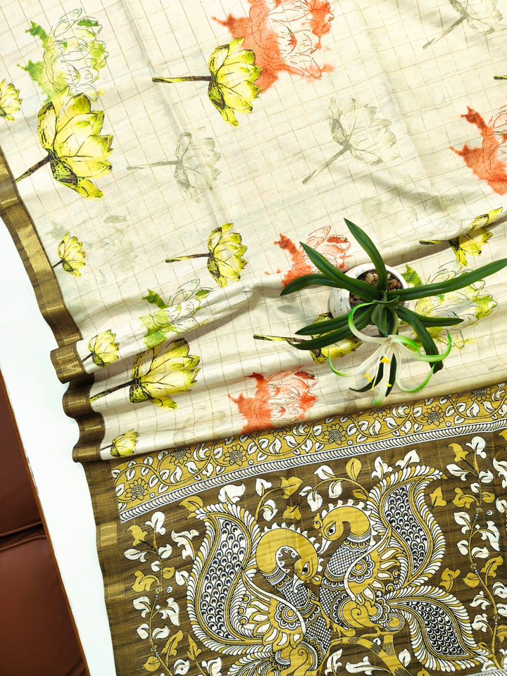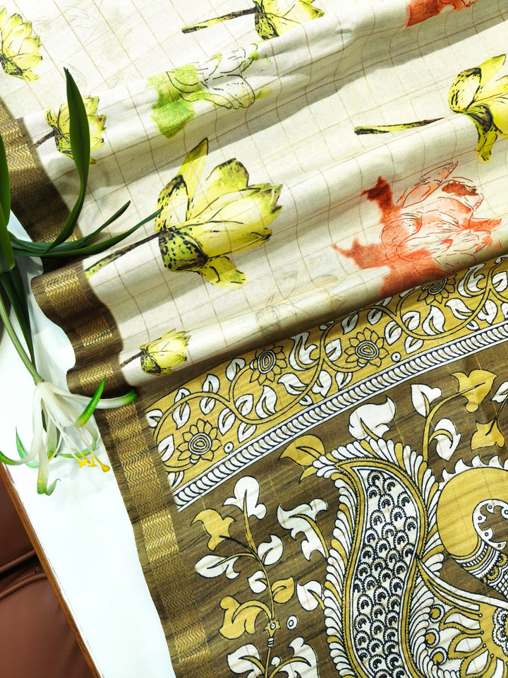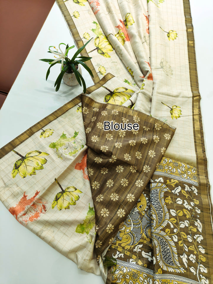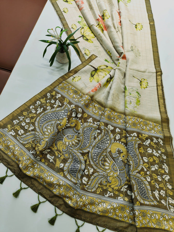Soft Tussar Checks Saree With Kalamkari Print Saree - MEHNDI