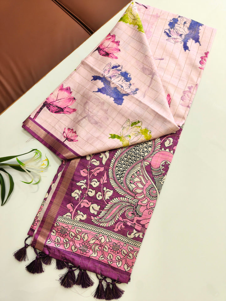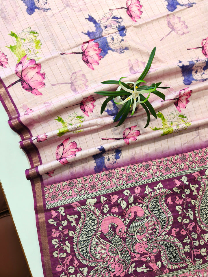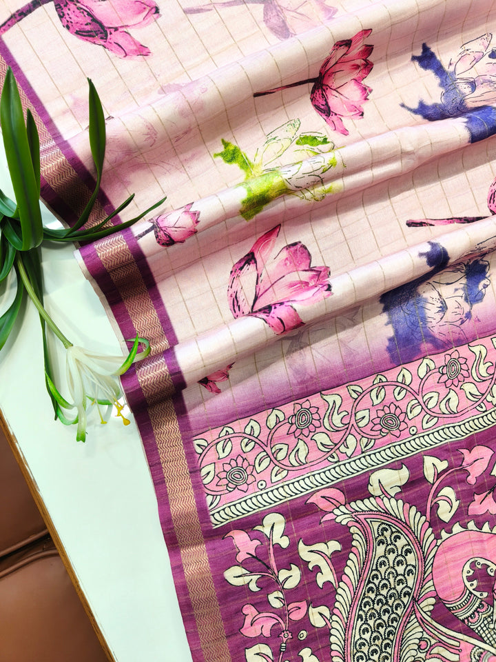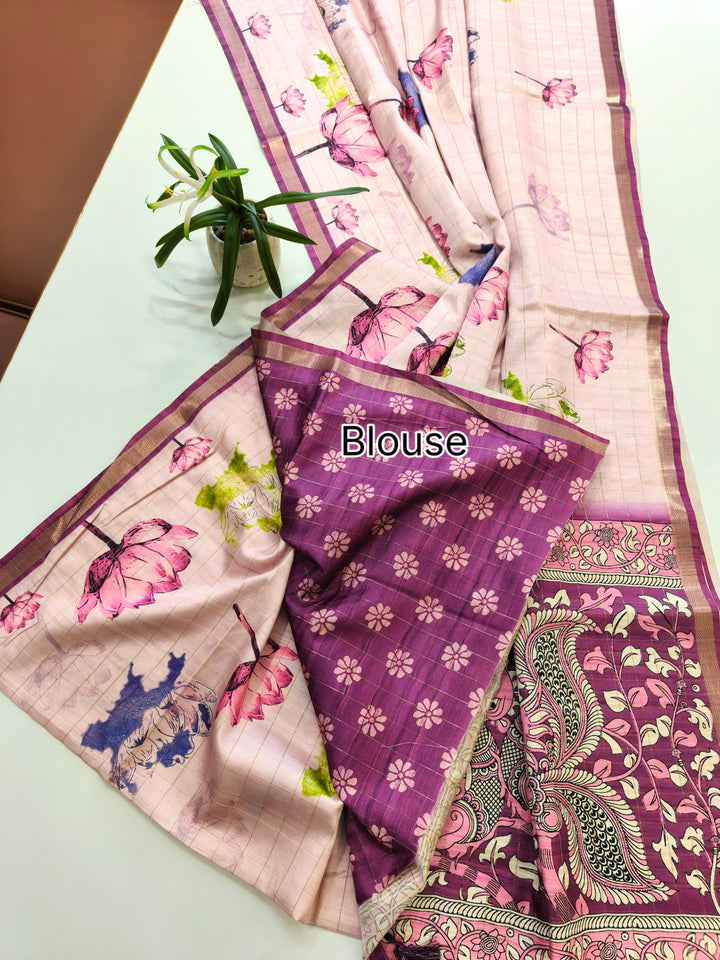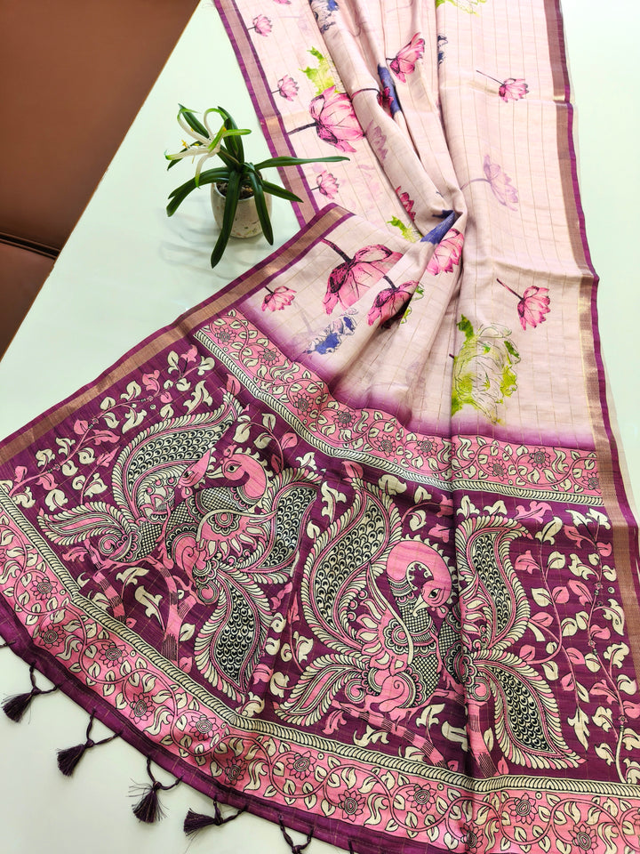 Soft Tussar Checks Saree With Kalamkari Print Saree - WINE