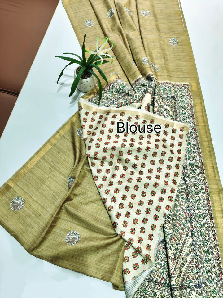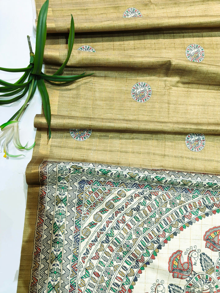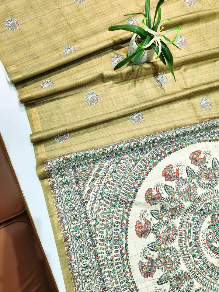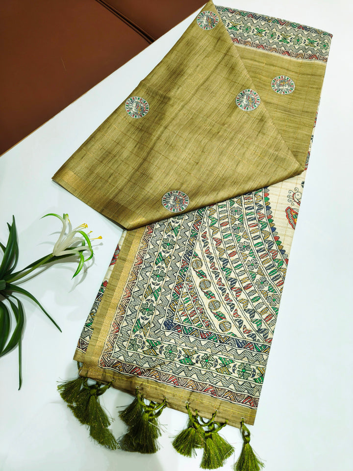 Soft Tussar Silk With Madhubani Print Saree - MAHENDI