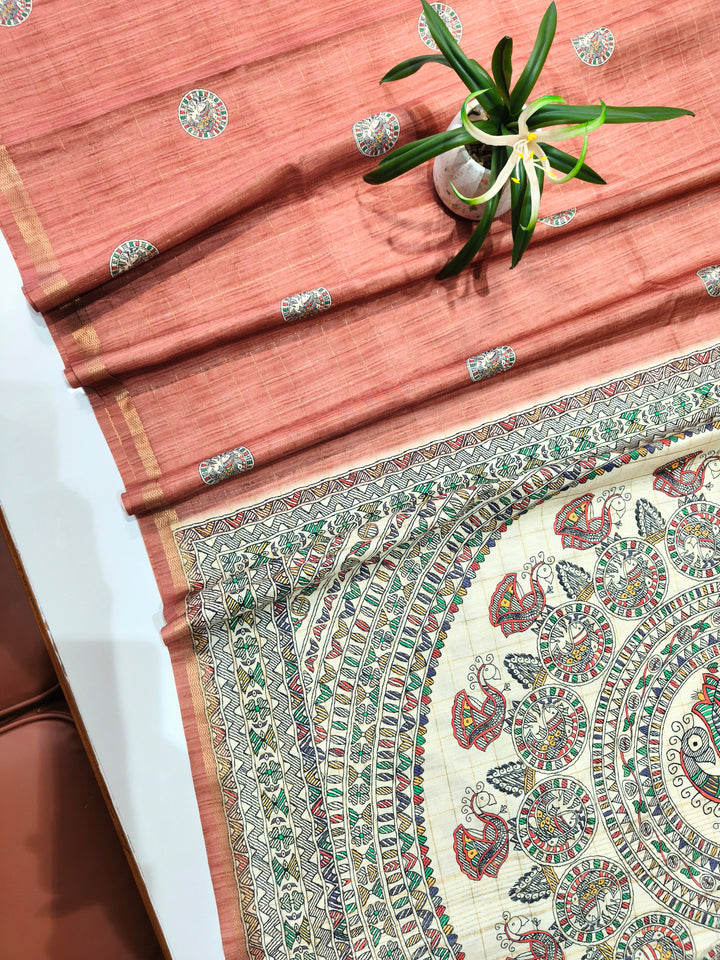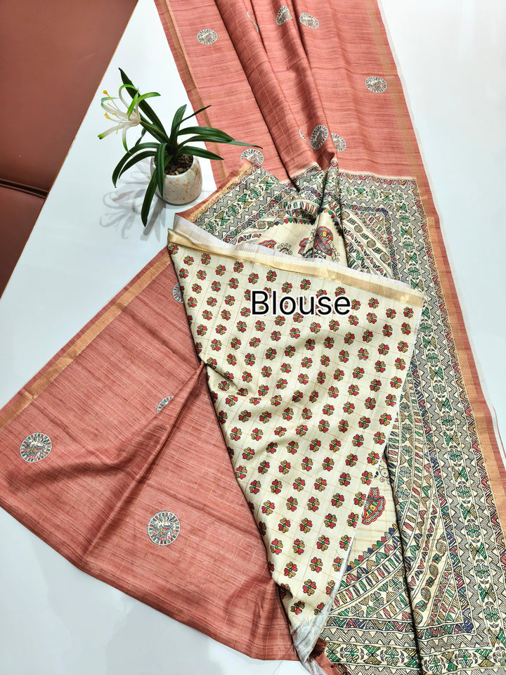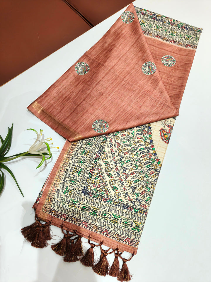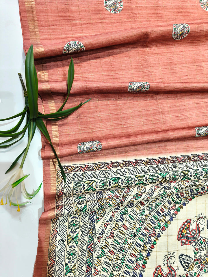 Soft Tussar Silk With Madhubani Print Saree - PEACH