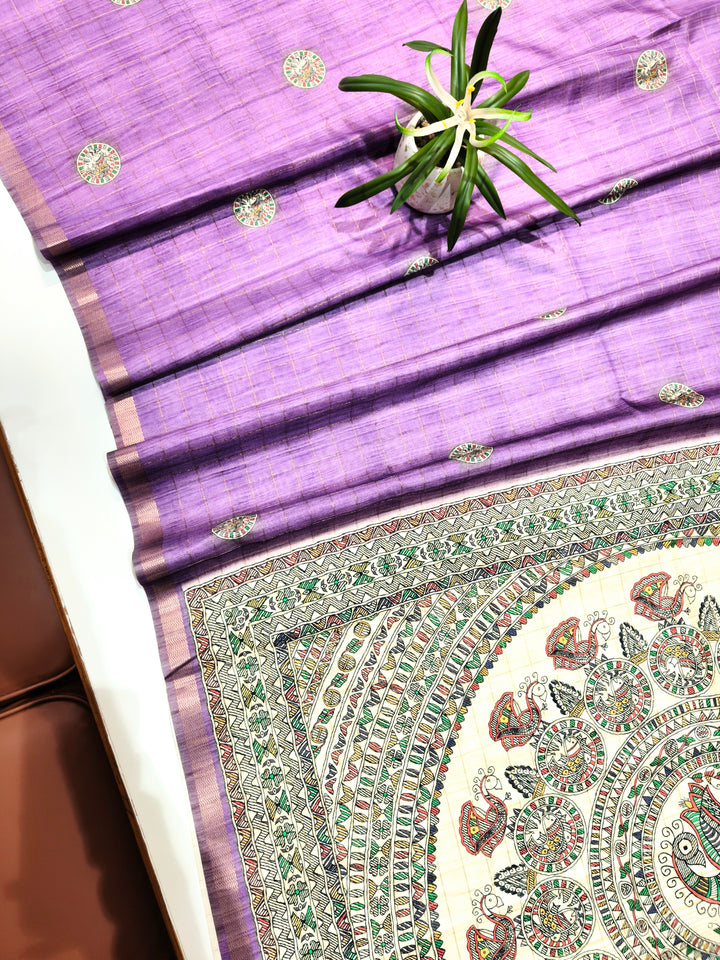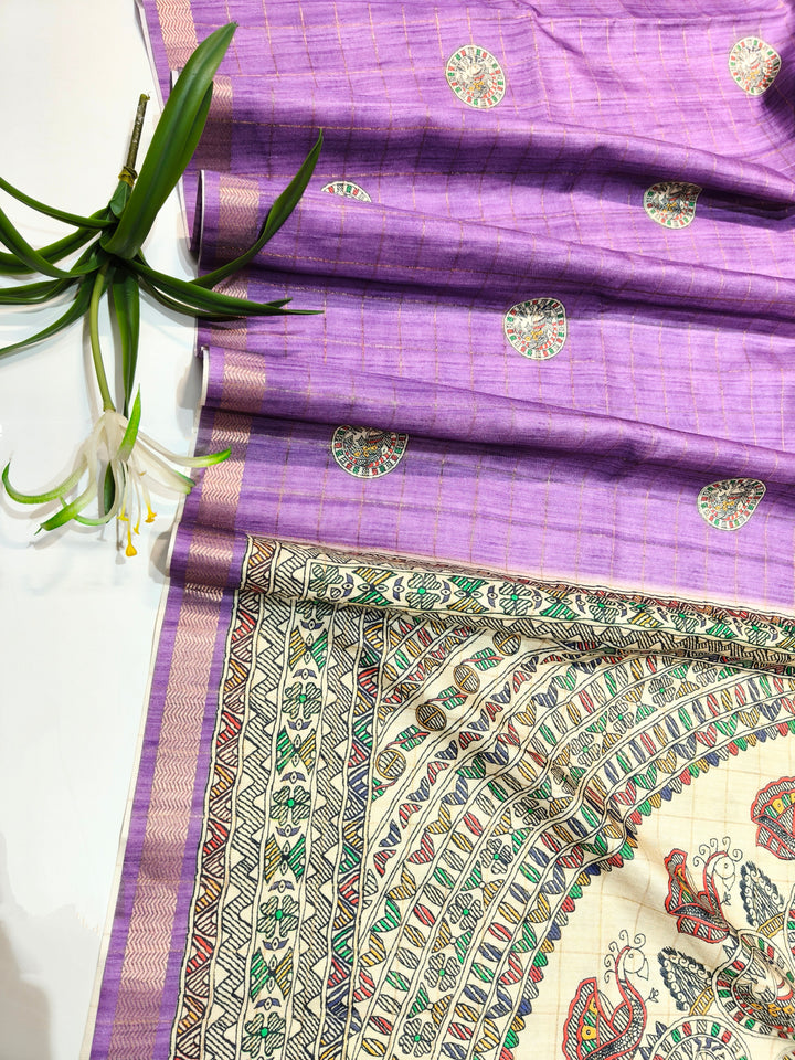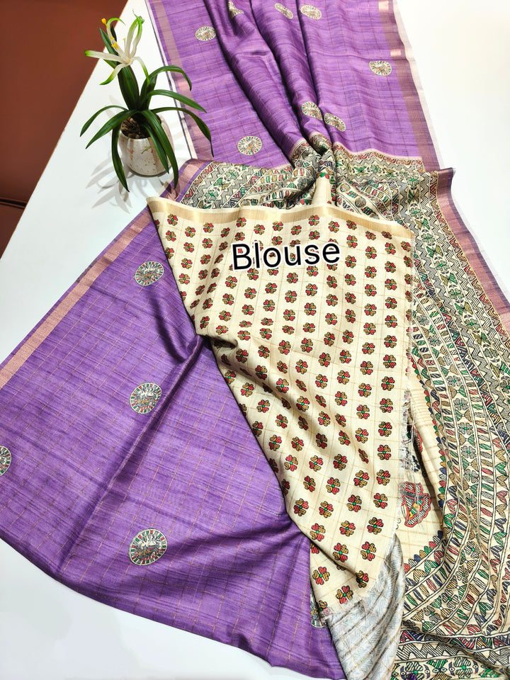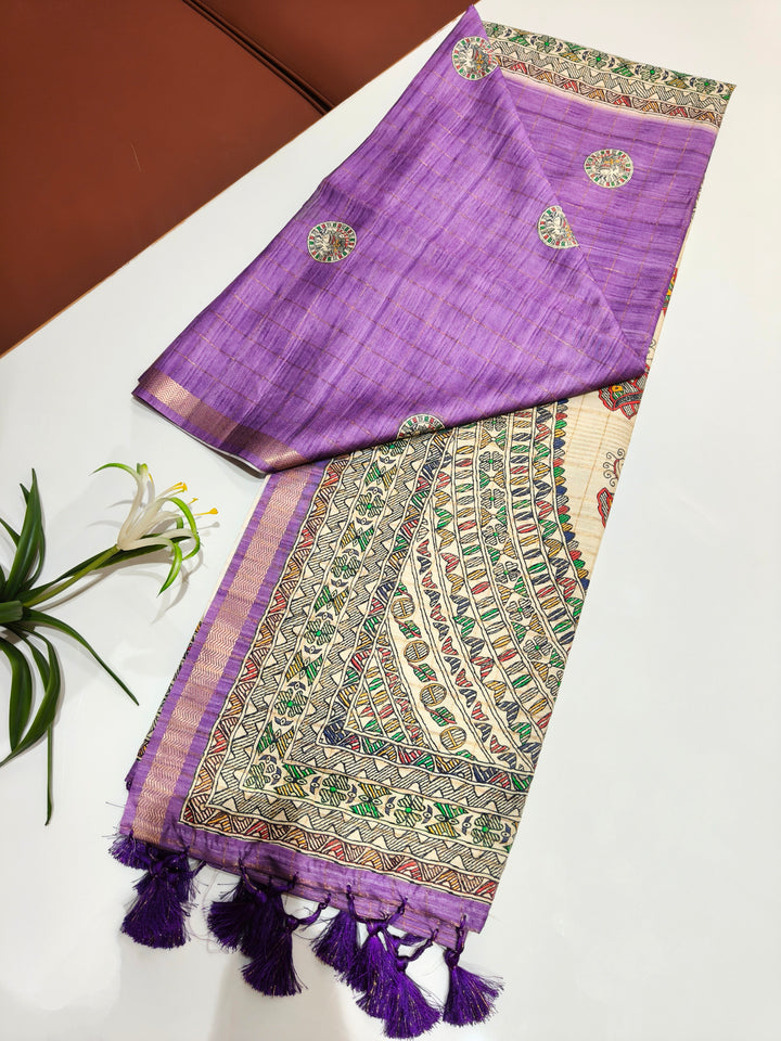 Soft Tussar Silk With Madhubani Print Saree - PURPLE