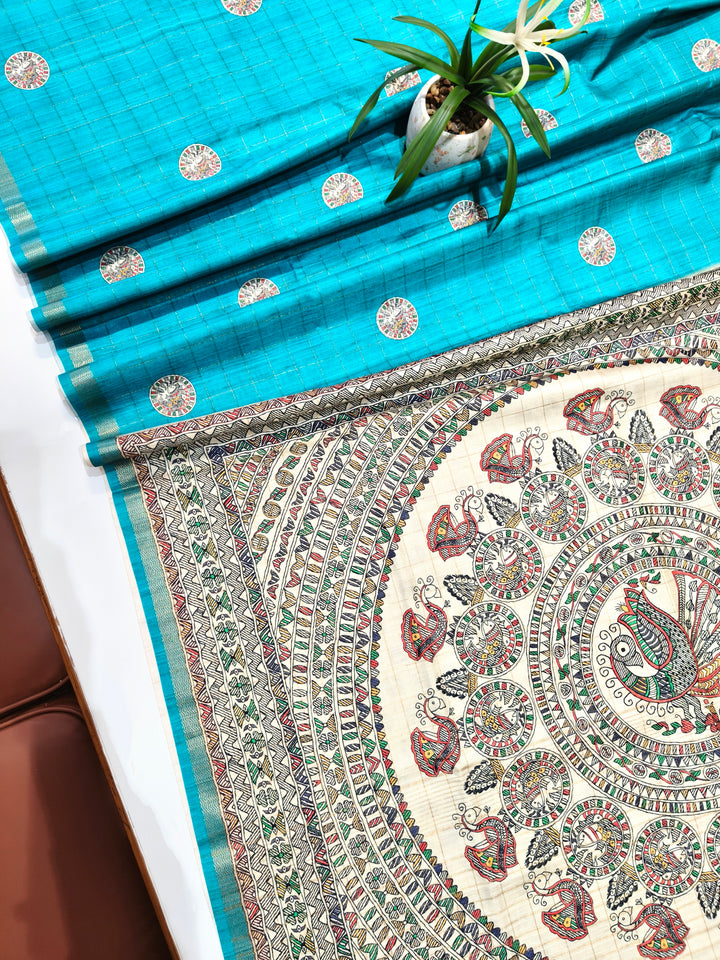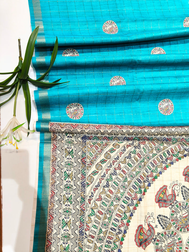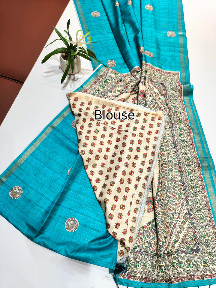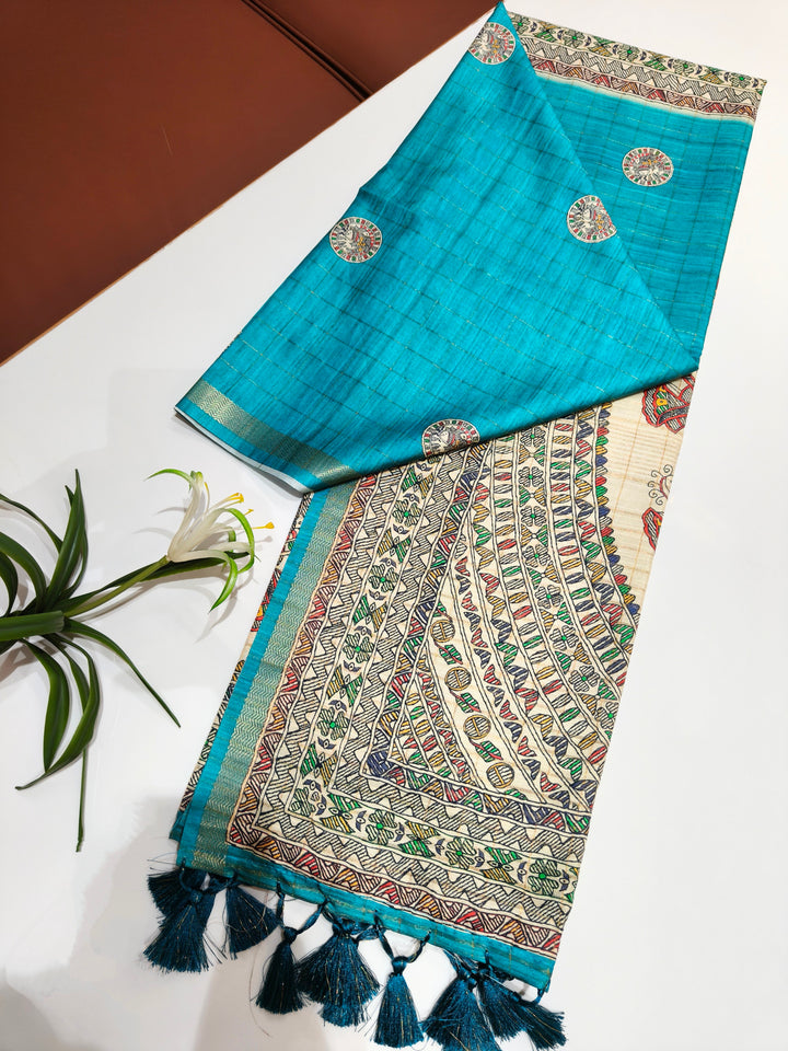 Soft Tussar Silk With Madhubani Print Saree - BLUE