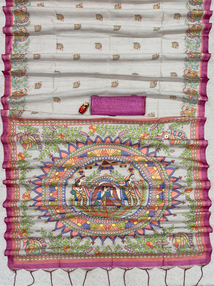Tussar Silk Madhubani Print Saree - GREY
