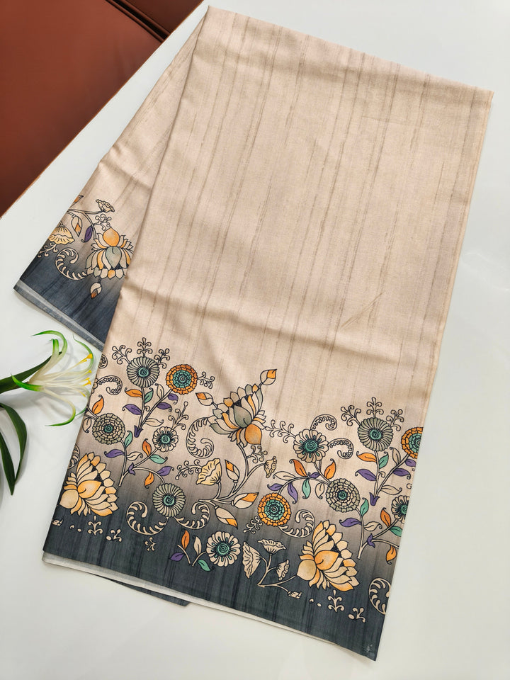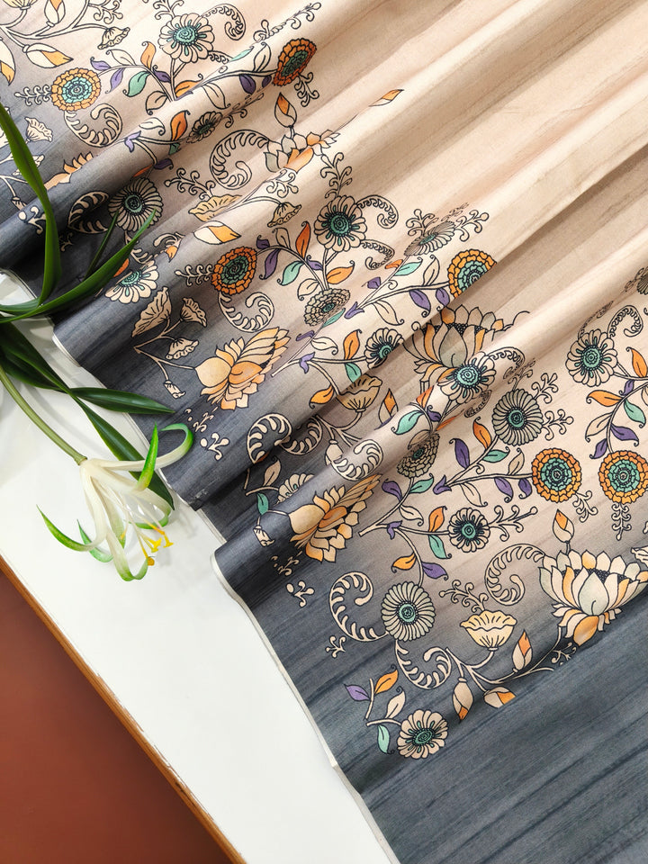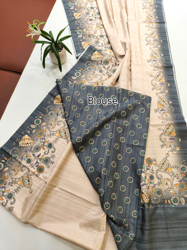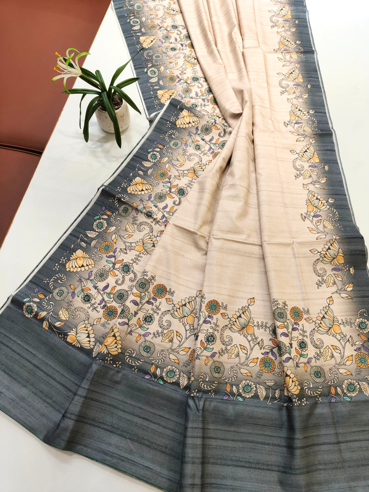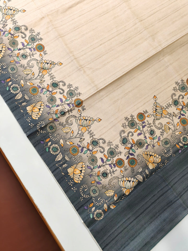 Tussar Silk Saree With Floral Print Pallu - Grey