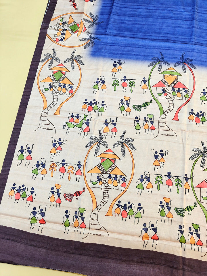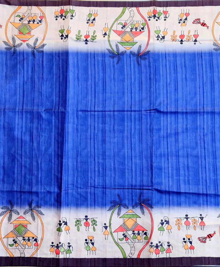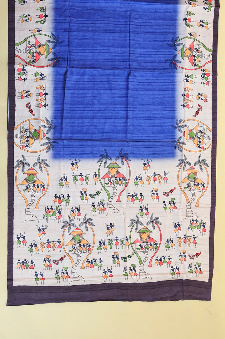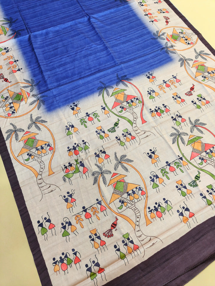 Tussar Silk Saree With Warli Print Pallu - Blue