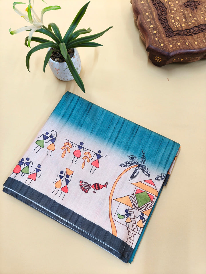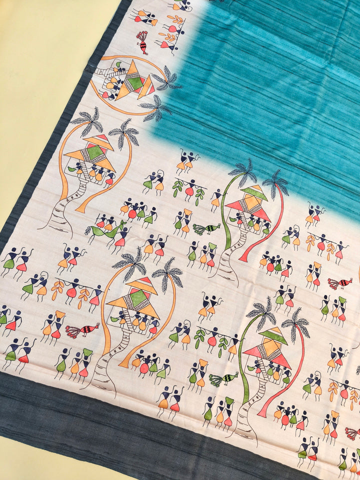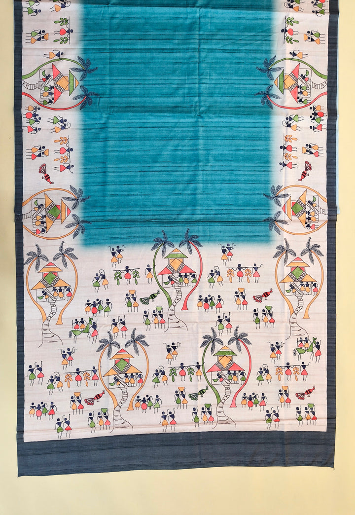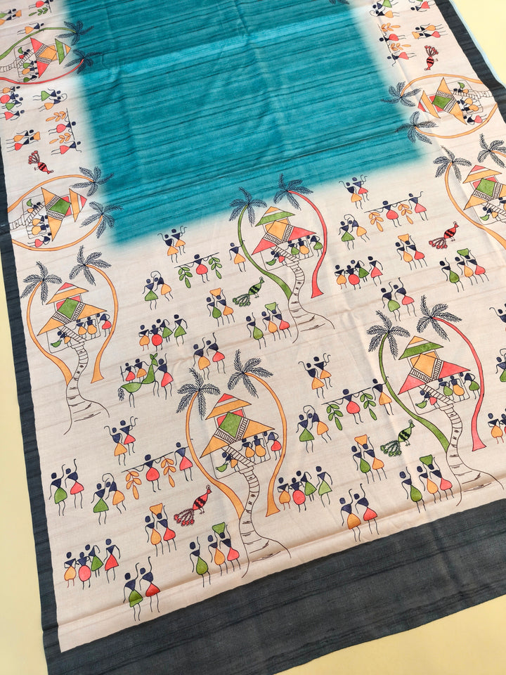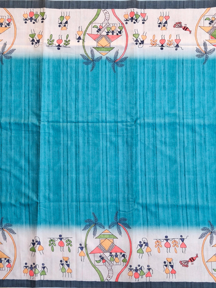 Tussar Silk Saree With Warli Print Pallu - Firozi