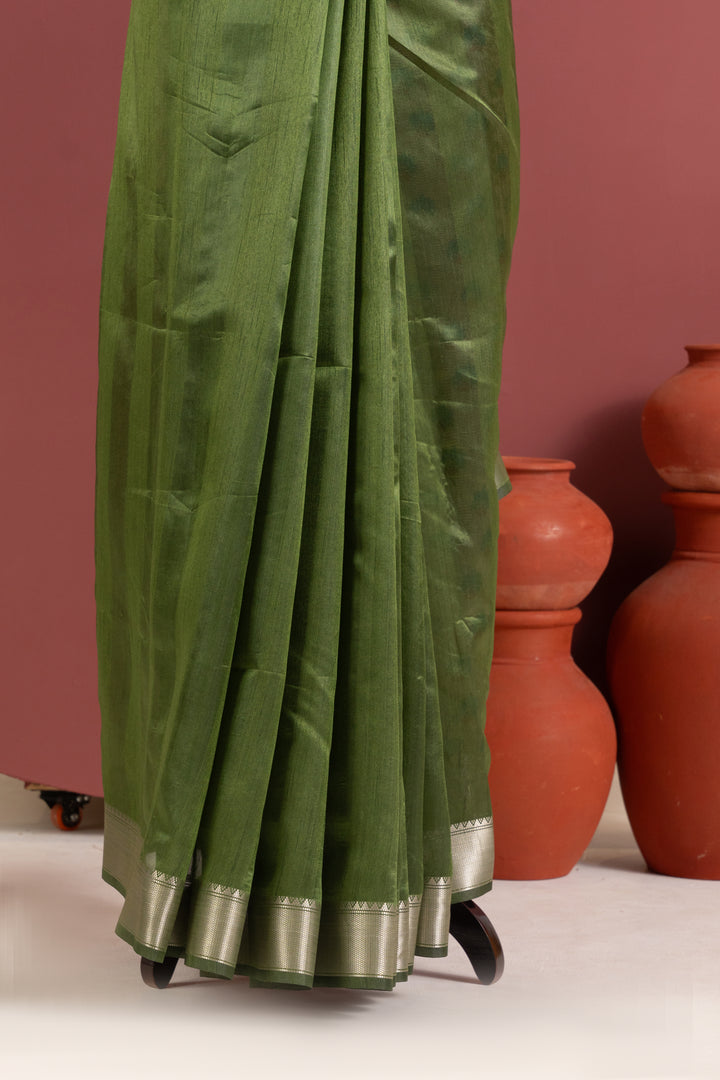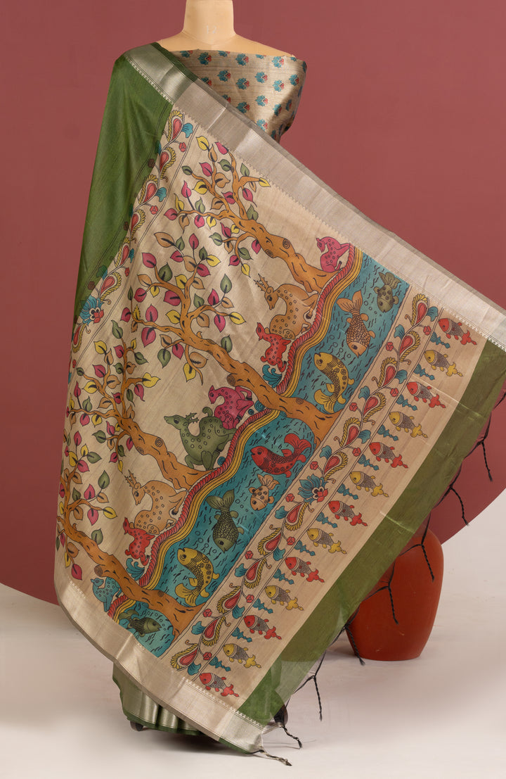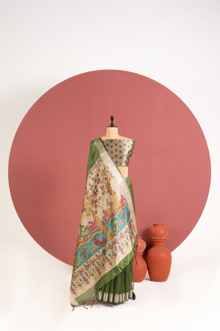Soft Raw Silk Kalamkari Printed Pallu - MEHENDI