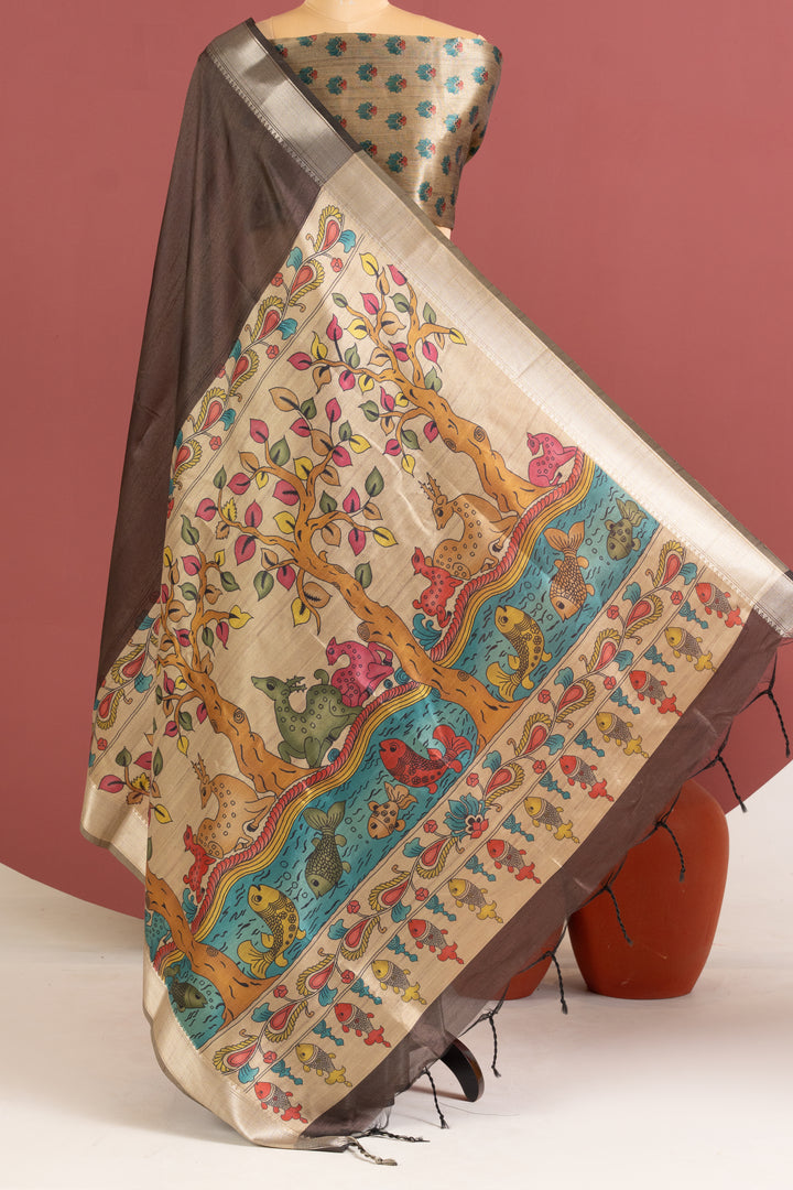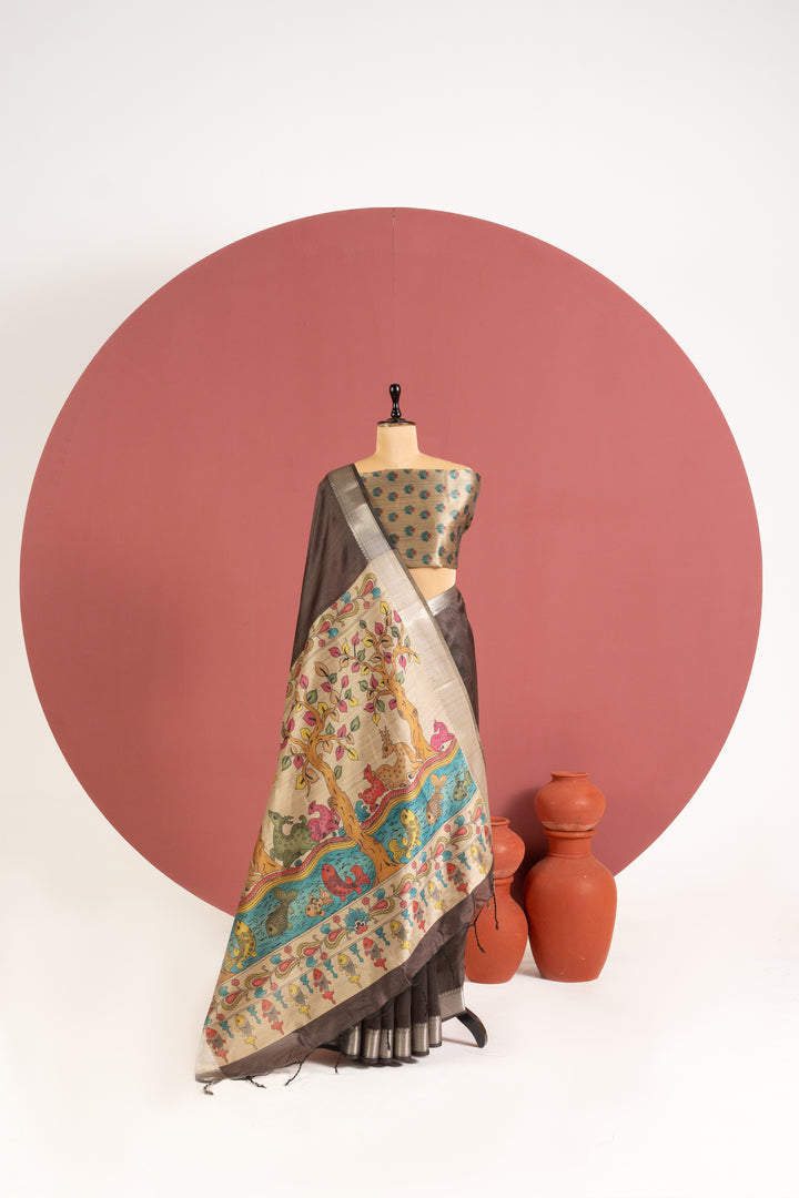 Soft Raw Silk Kalamkari Printed Pallu - COFFEE