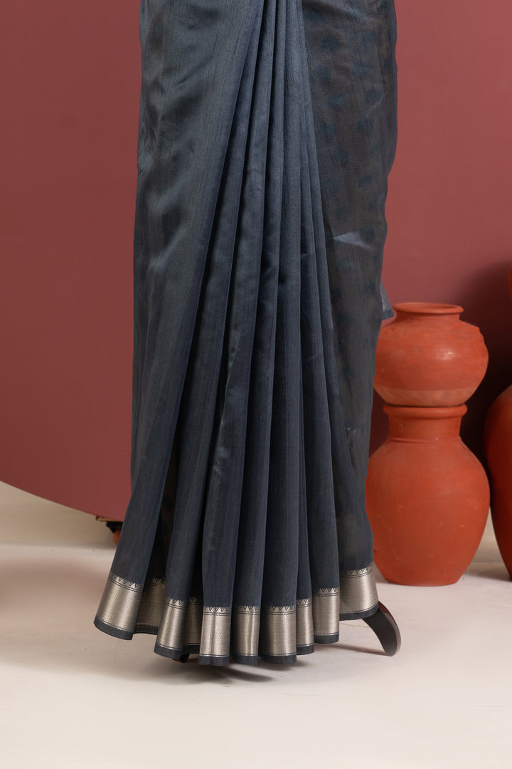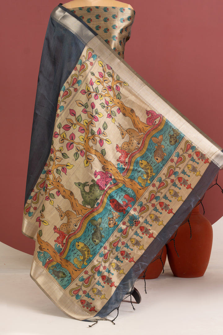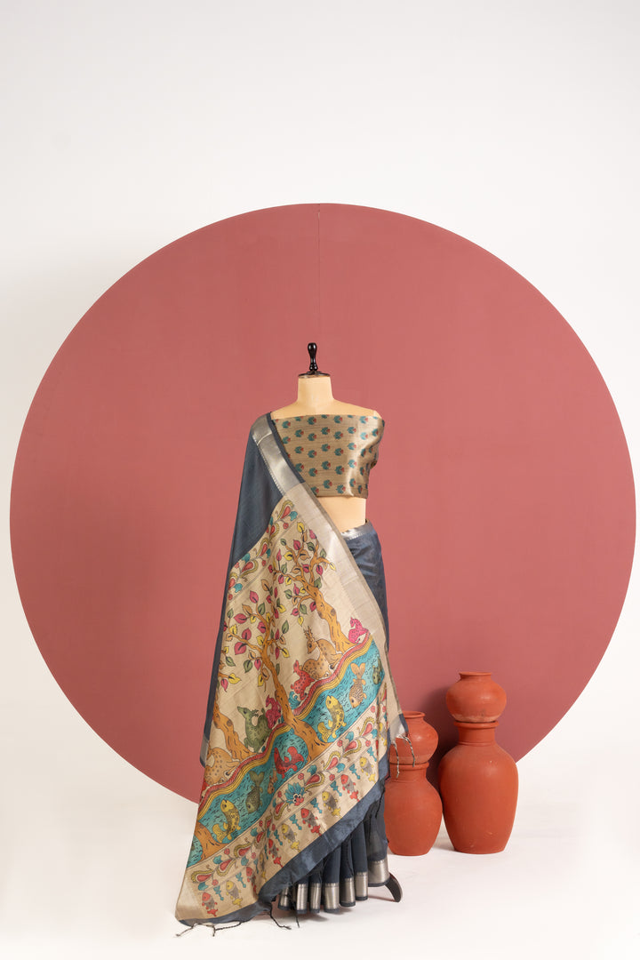 Soft Raw Silk Kalamkari Printed Pallu - GREY