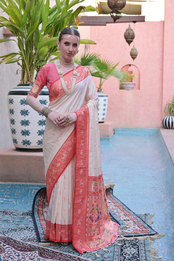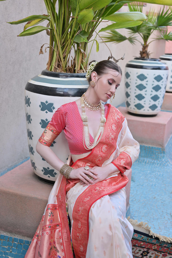 WHITE PAITHANI SILK WOVEN SAREE